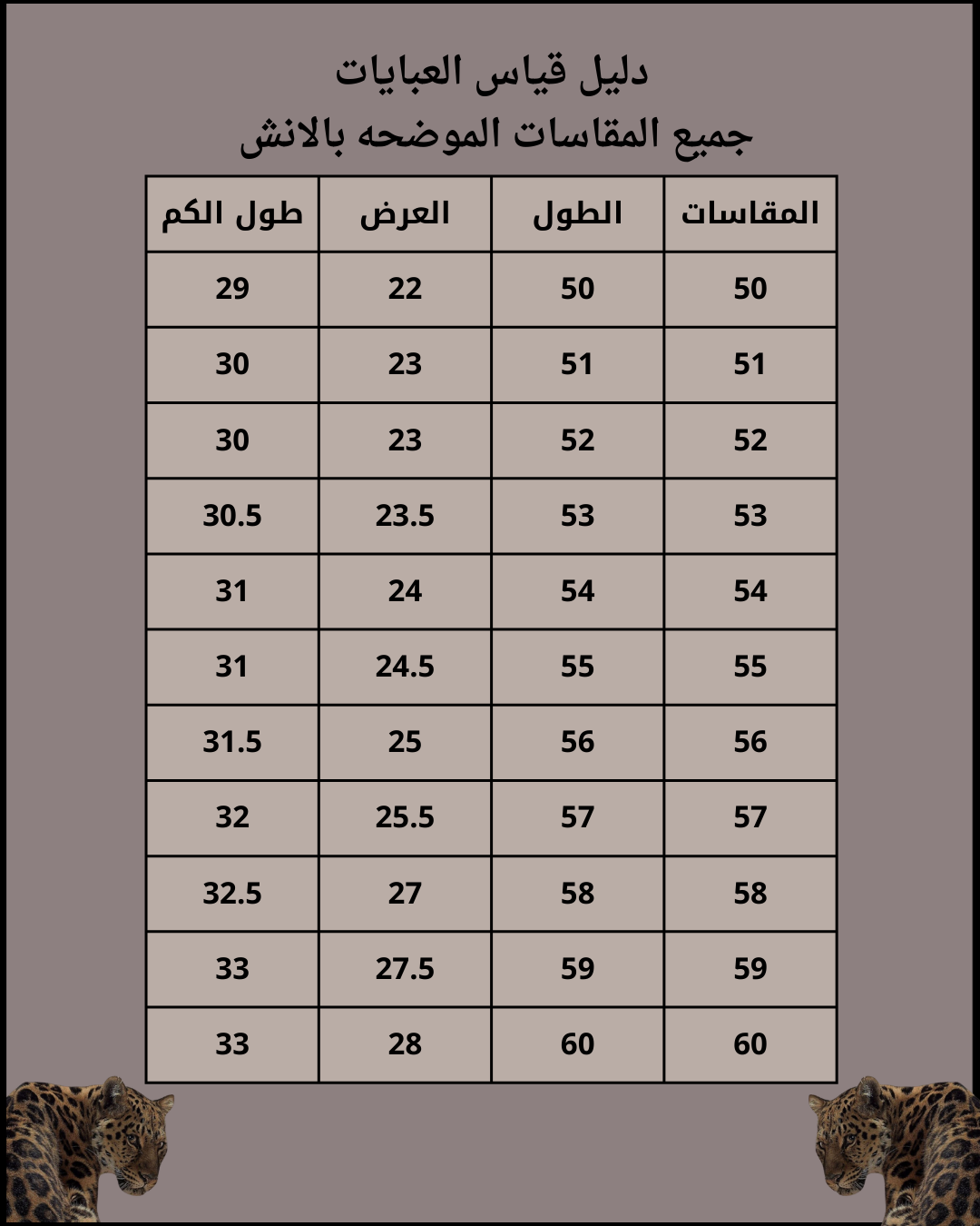 جدول المقاسات